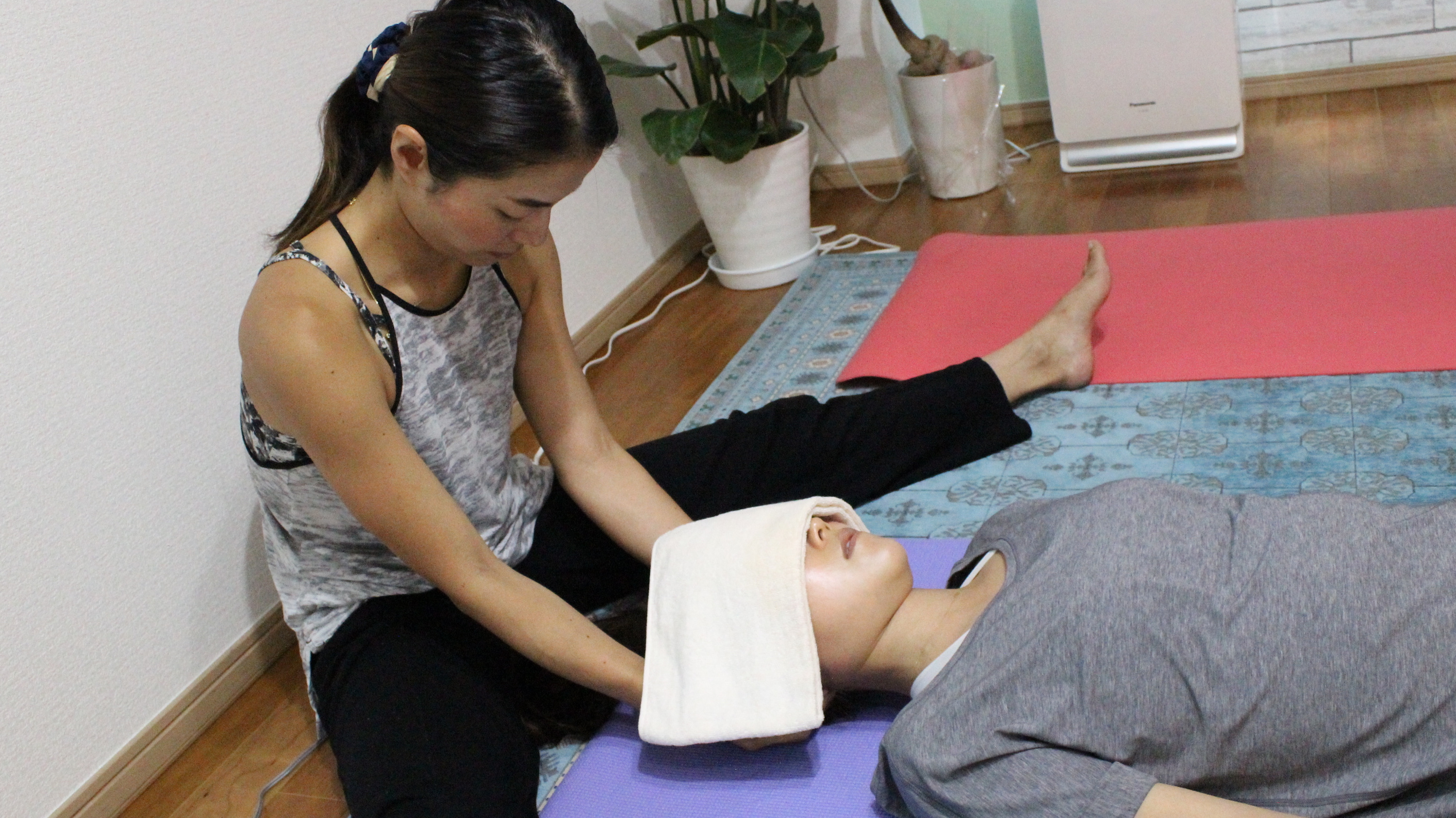動きやすい服装にお着替えをして頂き、ヨガマットの上で楽にしてお待ち頂きます。